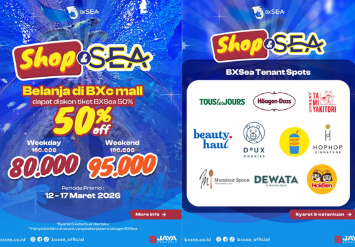 Cukup belanja di tenant BXc Mall pilhan, yang bekerja sama dengan min. pembelian Rp250.000, kamu sudah bisa mendapatkan discount 50% tiket masuk BXSea. Wooww banget kan?